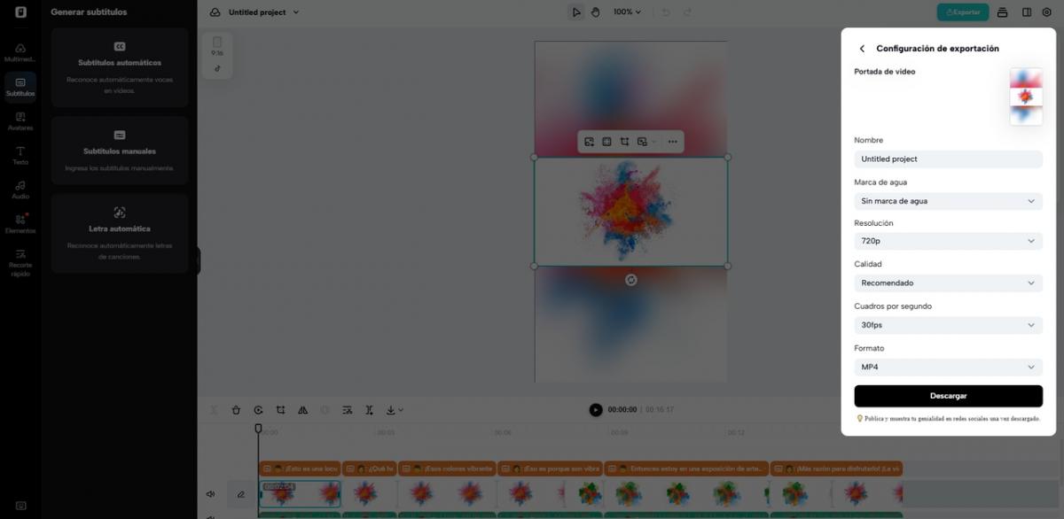 Cuando tu video esté listo, haz clic en "Exportar" para guardarlo, "Publicar" para compartirlo en redes sociales, o "Descargar" para descargarlo con la resolución, formato y calidad que prefieras.
