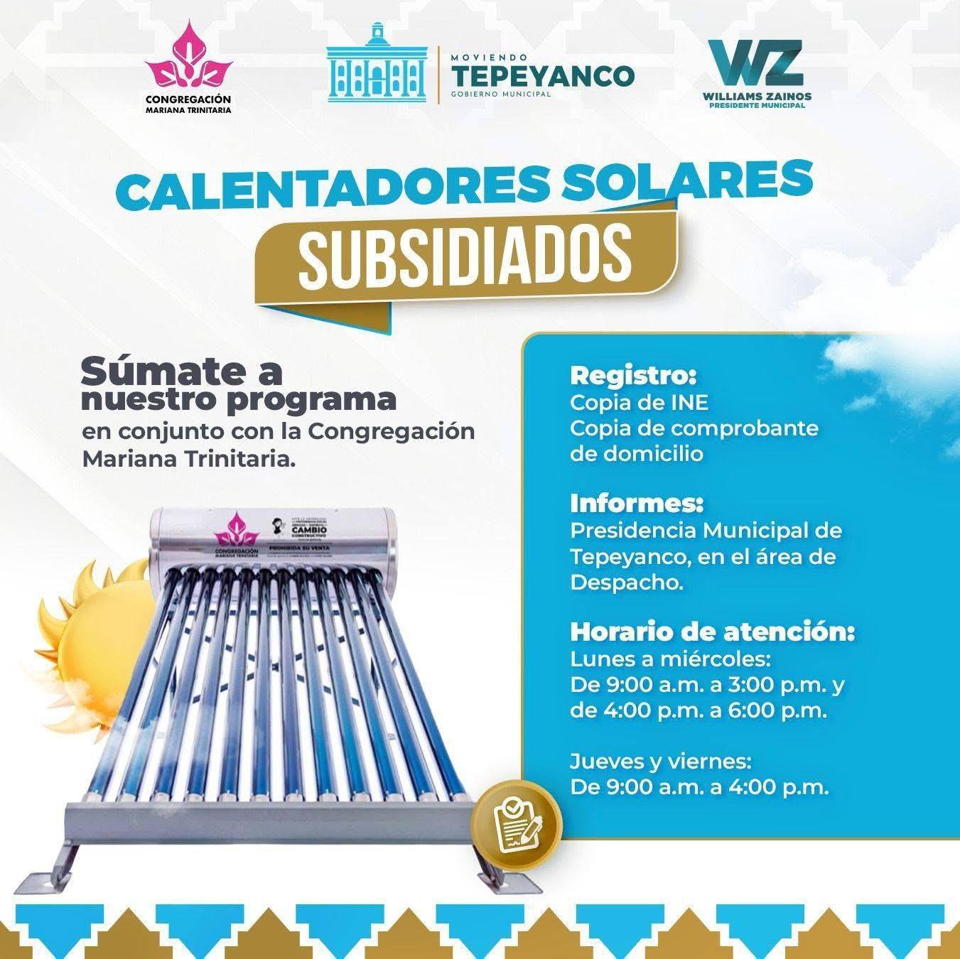 El Gobierno Municipal, en coordinación con la Congregación Mariana Trinitaria, te invita a participar en el programa de calentadores solares y tinacos subsidiados.