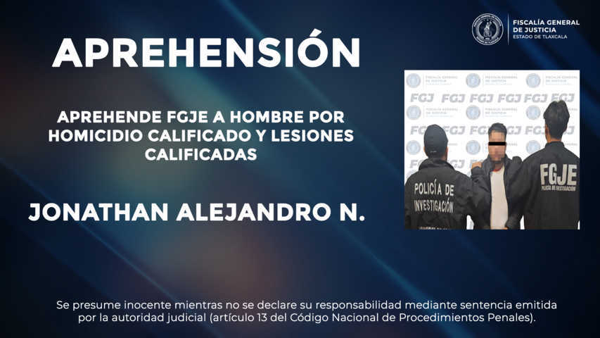 La Policía de Investigación de la Fiscalía General de Justicia del Estado (FGJE) aprehendió a Jonathan Alejandro N. por los delitos de homicidio calificado y lesiones calificadas, por los hechos ocurridos el 21 de julio de 2024 en el municipio de Huamantla.