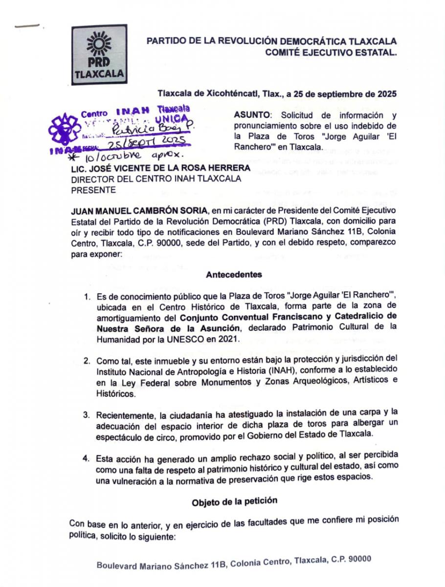 A través de un oficio dirigido a José Vicente de la Rosa Herrera, director del centro INAH Tlaxcala, el dirigente acusó de manera implícita un posible conflicto de interés, debido a la relación familiar de Mena con la gobernadora, y reiteró que los tlaxcaltecas tienen derecho a conocer los detalles de los gastos y los criterios de selección de proveedores.