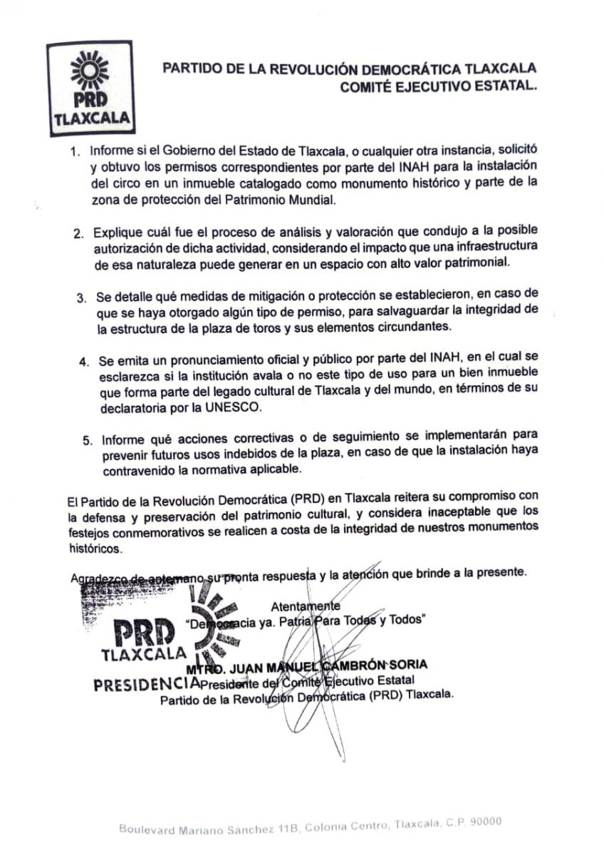 “No estamos en contra de las celebraciones ni del entretenimiento, pero sí exigimos que se hagan con responsabilidad, legalidad y respeto al patrimonio. Es inaceptable que eventos con fines recreativos pongan en riesgo bienes históricos de Tlaxcala”, afirmó Cambrón.
