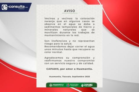 La Comisión de Agua Potable y Alcantarillado del Municipio de Huamantla (CAPAMH) informa a la ciudadanía que, derivado de los trabajos de mantenimiento en la red hidráulica, en algunas zonas del municipio se ha detectado una ligera coloración naranja en el agua.