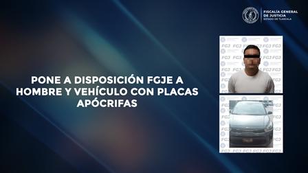 Elementos de la Policía de Investigación de la Fiscalía General de Justicia del Estado (FGJE) pusieron a disposición a Joan Edgar N., así como un vehículo marca Kia, tipo Sedán, modelo 2021, por el probable uso indebido de placas.