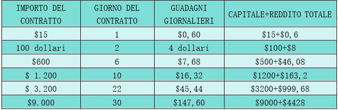 4. La liquidazione automatica giornaliera dei profitti ti consente di visualizzare i dettagli dei profitti in qualsiasi momento. Alla scadenza del contratto, il capitale verrà interamente restituito, consentendoti di godere di un reddito passivo in tutta tranquillità.