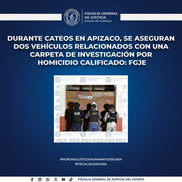 La Fiscalía General de Justicia del Estado (FGJE), a través de la Policía de Investigación, ejecutó de manera simultánea dos órdenes de cateo en el municipio de Apizaco, donde aseguró dos vehículos relacionados con una carpeta de investigación por el delito de homicidio calificado.