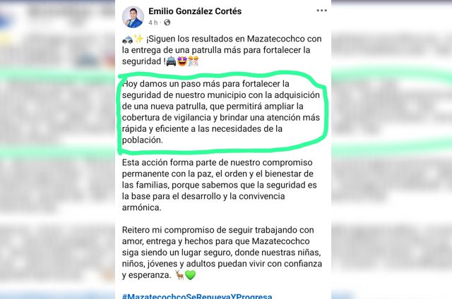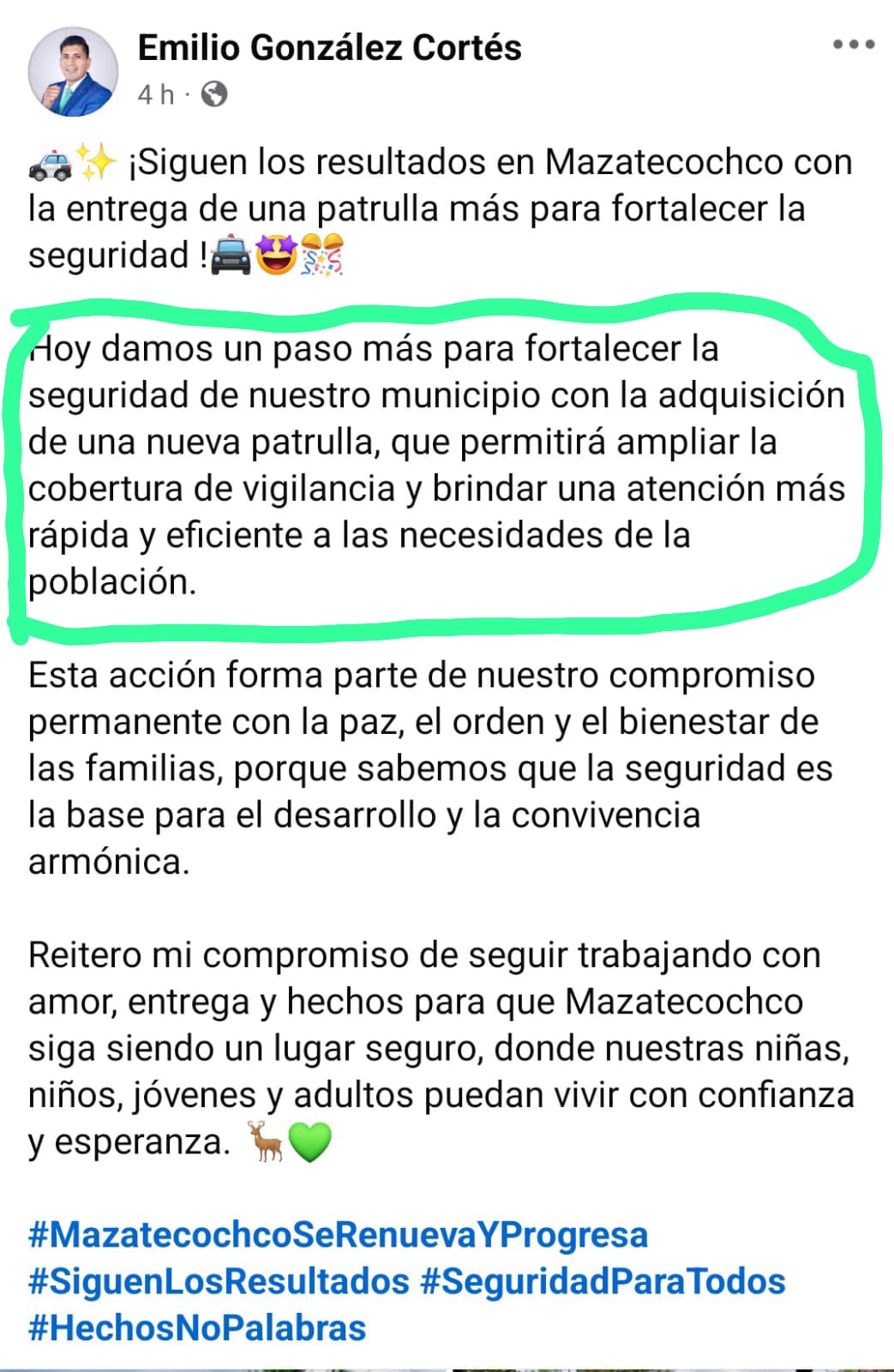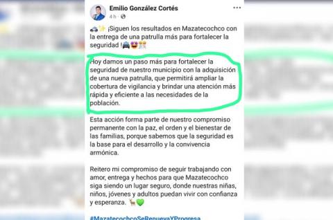 Y es que hace unos días González Cortés se desgañitó anunciando en su perfil personal y en la propia página del ayuntamiento que mal dirige su aprendiz de vocero, el agresivo Gustavo Xicohtencatl alias el "guafis" y garrotero del trácala “consultorsillo” Jorge Xicohtencatl, que hicieron la entrega de una nueva patrulla para mejorar la deficiente seguridad del municipio y aseguró que se trataba de un gran logró en beneficio de la población.