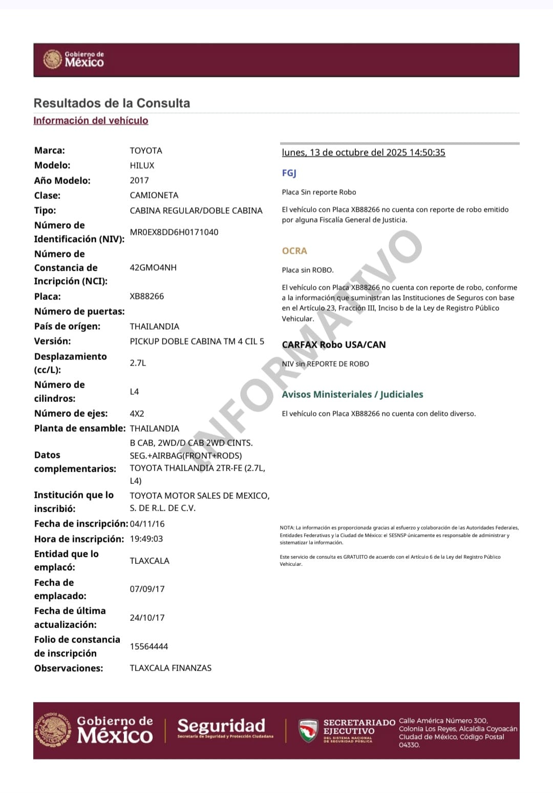Por si eso fuera poco, resulta que los pocos días que circuló la patrulla, lo hizo con placas sobrepuestas, pues las que aparecen en la unidad con número TL-066A-2 no corresponden a esta unidad, pues dicha camioneta se encuentra dada de alta el Registro Público Vehicular con las placas XB88266 del Estado de Tlaxcala, cuyo trámite se efectuó el 07 de septiembre de 2017.