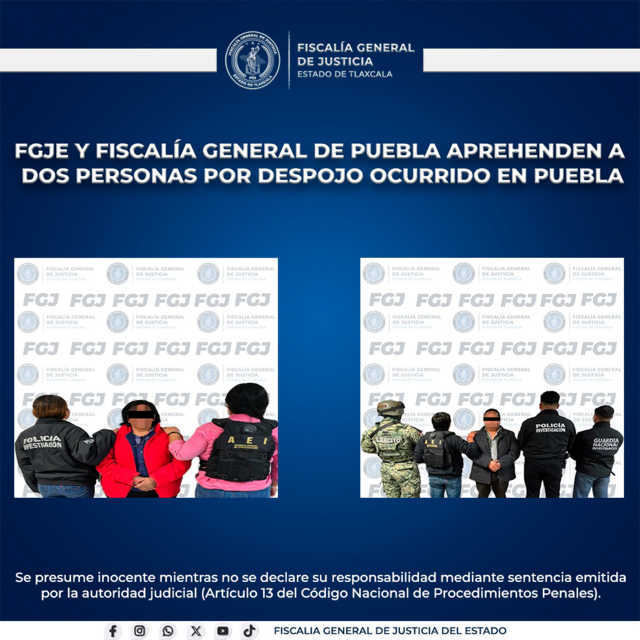 La Policía de Investigación de la Fiscalía General de Justicia del Estado (FGJE) colaboró con la Fiscalía General del Estado de Puebla (FGJ) para aprehender a Sofía Micaela N. y Jorge N., por el delito de despojo ocurrido en Puebla.