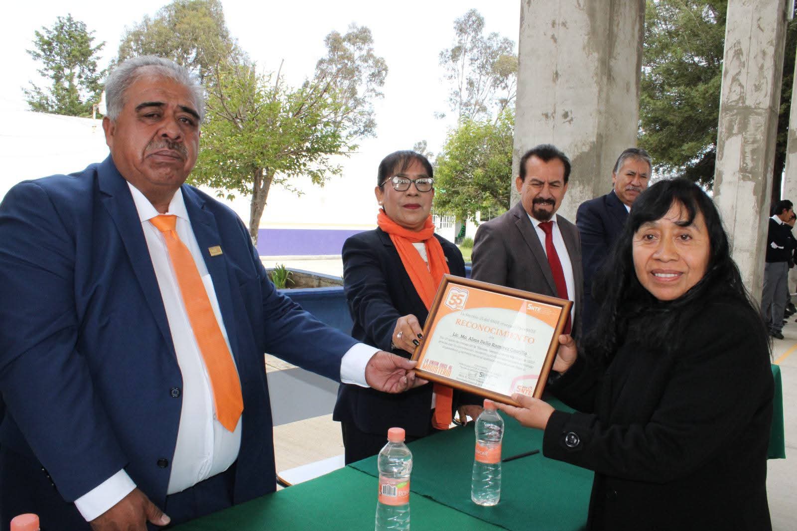 Una deuda que tenemos los dirigentes sindicales con los maestr@s y con el personal administrativo, es reconocer el trabajo que cotidianamente realizan nuestros compañer@s en las escuelas y en sus centros de trabajo en tales términos se expresó la Secretaria General de la Sección 55 , Teresa Meneses , quien asistió al reconocimiento del que fue objeto la lic. Alma Delia Ramirez Castillo, quien a tenido una brillante carrera administrativa en la Telesecundaria Mártires de 1910,