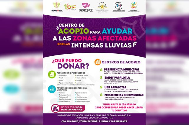 El gobierno de Papalotla instaló seis centros de acopio para recibir donaciones destinadas a las zonas del país afectadas por las intensas lluvias. La campaña acepta alimentos no perecederos y artículos de higiene personal, con plazo límite hasta el 25 de octubre.