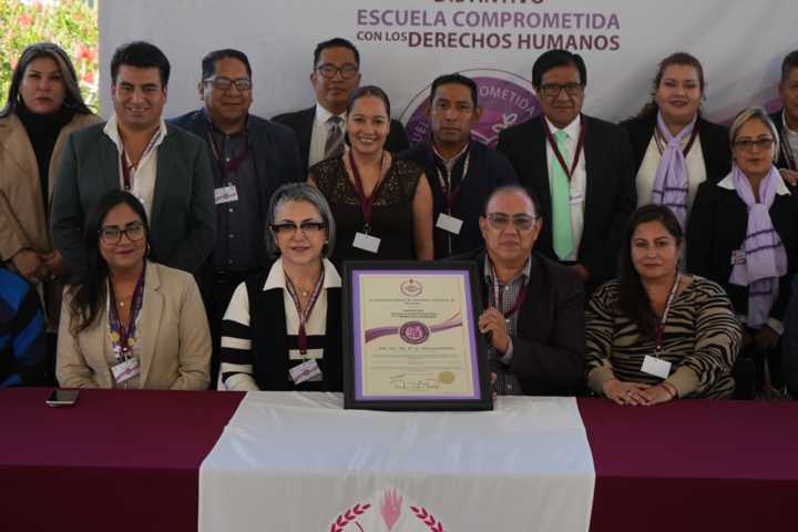 Durante la ceremonia, la presidenta de la Cedht, Jakquelline Ordóñez Brasdefer, reconoció el compromiso del personal directivo, docente, estudiantes, madres y padres de familia por integrar, a través de un trabajo conjunto, los principios de los derechos humanos en su práctica diaria, al fomentar un entorno inclusivo, respetuoso y solidario.