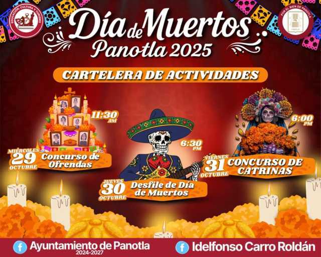 El Ayuntamiento de Panotla, a través de la Dirección de Educación, Cultura y Turismo, invita a toda la ciudadanía a disfrutar de la cartelera de actividades que se han preparado con motivo del Día de Muertos 2025. Estas acciones buscan mantener vivas las tradiciones que nos identifican y fortalecer el sentido de comunidad entre las familias panotlenses.