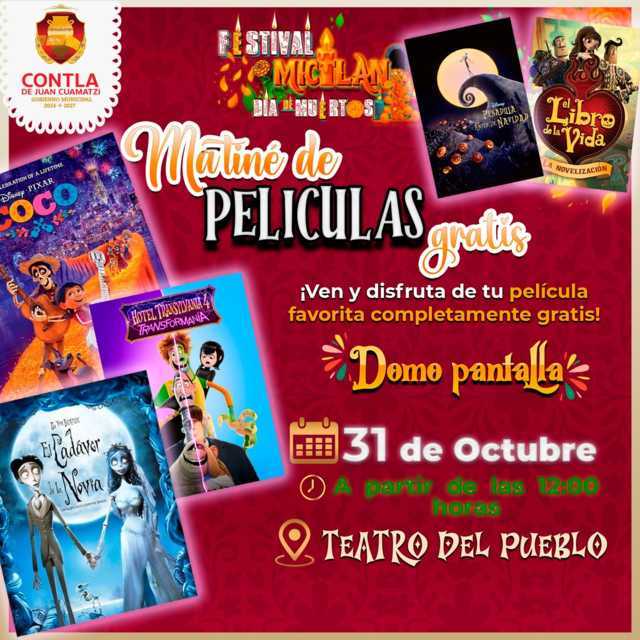 El Gobierno Municipal de Contla de Juan Cuamatzi, que encabeza la presidenta municipal Ana Ivonne Roldán Xolocotzi, anunció la realización de una Matiné de Películas Gratuitas como parte de las actividades del Festival Día de Muertos Mictlán.