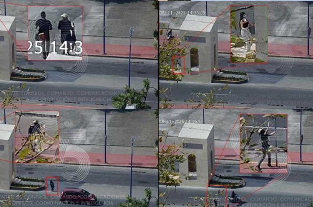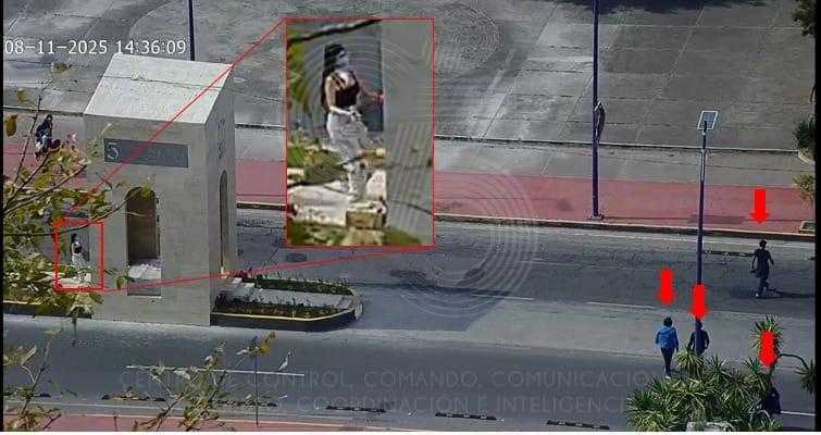 Mediante el monitoreo, las cámaras de videovigilancia captaron al menos a cinco jovenes con vestimenta oscura realizar pintas y colocar cartulinas con mensajes. Después, se refugiaron durante unos minutos en la Plaza Inn, frente al antiguo Asta Bandera, para después huir hacia distintos destinos.