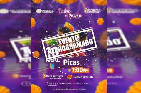 El Patronato para las Exposiciones y Ferias en la Ciudad de Tlaxcala informó que, debido a las condiciones climáticas adversas y los fuertes vientos registrados en las últimas horas por la entrada del frente frío número 13, el concierto del grupo “Picus”, programado para realizarse este lunes 10 de noviembre en el Teatro del Pueblo de “Tlaxcala, la Feria de Ferias 2025”, será reagendado.