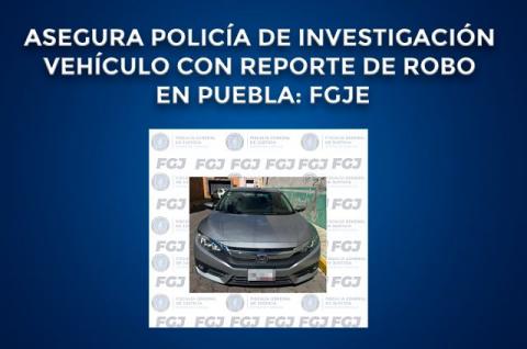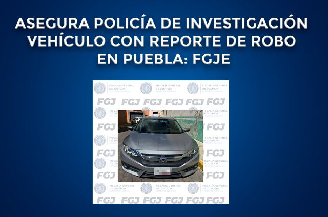Elementos de la Policía de Investigación de la Fiscalía General de Justicia del Estado (FGJE) aseguraron un vehículo marca Honda, tipo Sedán, modelo 2017, color plata, que contaba con reporte de robo en el estado de Puebla.