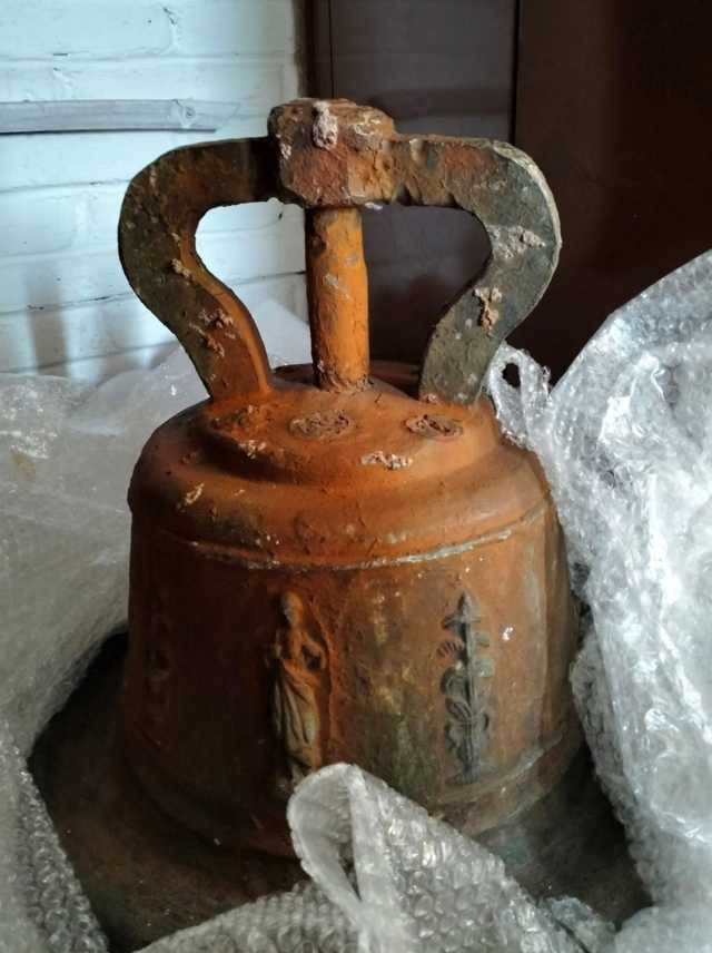 La campana, datada en el siglo XIX, presenta relieves con un ángel, una cruz de flores de lis, el Sagrado Corazón de Jesús y una planta que brota de un jarrón, posiblemente espigas de trigo, elementos que reflejan su valor artístico y religioso.