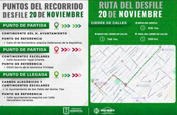 El Ayuntamiento de San Pablo del Monte dio a conocer la ruta que se seguirá en el tradicional desfile del 20 de noviembre, como parte de las actividades programadas por el aniversario de la Revolución Mexicana.