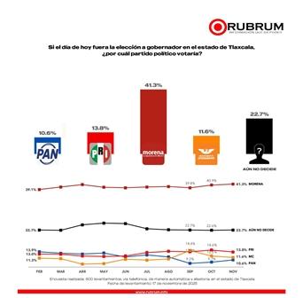 Tlaxcala se adelanta al clima electoral de 2027 y la más reciente encuesta de la empresa Rubrum confirma que la contienda por la gubernatura ya tomó forma. De acuerdo con el estudio levantado el 17 de noviembre de 2025, mediante encuesta telefónica automatizada con un nivel de confianza del 95% y un margen de error de +/- 3.8%, Morena se mantiene como la fuerza dominante al registrar un 41.3% de intención de voto, una ventaja que coloca al partido en una posición estratégica mientras la oposición intenta recomponer su ruta.