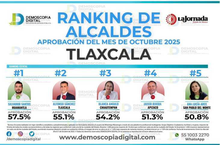 Este resultado coincide con la medición de Demoscopia Digital, que en su ranking estatal lo ubica en el primer lugar entre los alcaldes de Tlaxcala, obteniendo una aprobación del 57.5%, consolidándose como el mejor evaluado en la entidad.