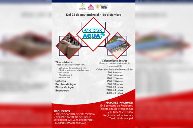 El gobierno municipal de Papalotla lanzó el programa "Cadena de Agua" que estará vigente del 25 de noviembre al 4 de diciembre, una iniciativa que busca mejorar la calidad de vida de las familias del municipio mediante el acceso subsidiado a equipamiento hidráulico y tecnología solar.