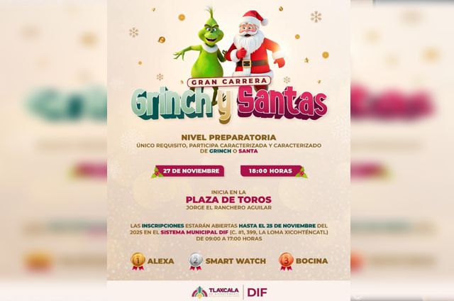 En el marco de los festejos navideños de este año, el Ayuntamiento de Tlaxcala, que preside Alfonso Sánchez García, a través del Sistema Municipal DIF, invita a la ciudadanía a la carrera “Grinch y Santas”, que se llevará a cabo este jueves 27 de noviembre a las 18:00 horas, el cual tendrá como punto de partida la Plaza de Toros Jorge Aguilar “El Ranchero” y culminará frente a la sede del Palacio Municipal.