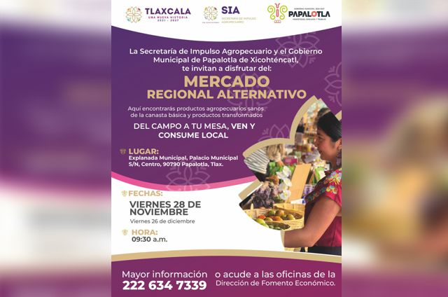 Este mercado alternativo llegará nuevamente a Papalotla el viernes 28 de noviembre y el viernes 26 de diciembre, ambas jornadas a partir de las 09:30 horas en la explanada municipal del Palacio Municipal de Papalotla, ubicado en el centro del municipio.
