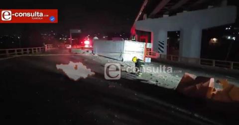De acuerdo con informes preliminares, la unidad transportaba flores desde Veracruz hacia el Estado de México cuando, por causas aún no confirmadas, el conductor perdió el control y terminó fuera de la carretera, provocando daños en muros, barandales y luminarias.