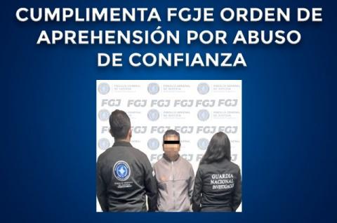 La Policía de Investigación de la Fiscalía General de Justicia del Estado (FGJE) cumplimentó una orden de aprehensión en contra de Casimiro N., por su probable participación en el delito de abuso de confianza.