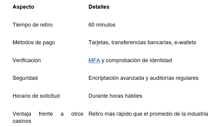 Tabla resumen: Procesamiento de retiros en Ganabet Casino