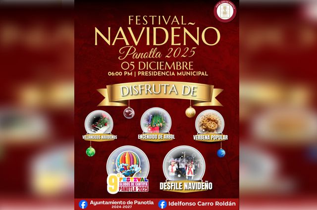 El H. Ayuntamiento de Panotla, a través del Presidente Municipal Idelfonso Carro Roldán, invita a todas las familias del municipio al Festival Navideño Panotla 2025, que se realizará el 5 de diciembre a las 06:00 PM en la explanada de la Presidencia Municipal.