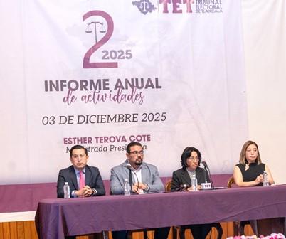 En sesión solemne del Pleno del Tribunal Electoral de Tlaxcala, la Magistrada Presidenta, Esther Terova Cote, dio cumplimiento a la presentación del Informe Anual de actividades, correspondiente al ejercicio 2025, destacando la labor jurisdiccional realizada en la resolución de controversias, así como las actividades de difusión, capacitación, vinculación y administración de los recursos, en el que la titular del organismo resaltó que la rendición de cuentas y la transparencia en el ejercicio de la función pública fortalecen al Estado de derecho.
