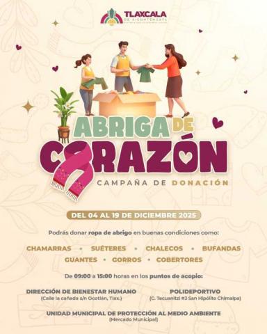 El Ayuntamiento de Tlaxcala inició el pasado fin de semana la campaña de donación “Abriga de Corazón”, una iniciativa solidaria que busca reunir ropa de abrigo en buenas condiciones para apoyar a personas en situación vulnerable durante esta temporada invernal.