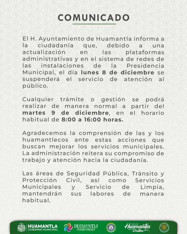 El H. Ayuntamiento de Huamantla informa a la ciudadanía que, debido a una actualización en las plataformas administrativas y en el sistema de redes de las instalaciones de la Presidencia Municipal, el día lunes 8 de diciembre se suspenderá el servicio de atención al público.