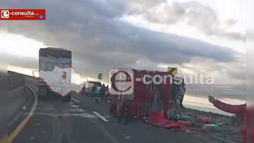 Se registró un accidente en el libramiento de Huamantla, a escasos metros de las instalaciones de la Guardia Nacional, donde un camión tipo torton que transportaba una carga de verduras terminó varado tras sufrir una aparente falla de conducción.