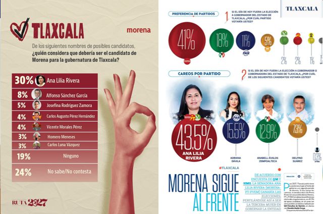 Si hoy fueran las elecciones, el Partido Movimiento de Regeneración Nacional (Morena) obtendría el triunfo en Tlaxcala con el 41 % de la votación total, y la Senadora Ana Lilia Rivera Rivera sería la ganadora de la gubernatura, pues se ubica como la mejor aspirante de este instituto político a la candidatura al gobierno del estado, al alcanzar un 30% en un careo interno, y hasta el 43.5% en un careo con posibles candidaturas postuladas por otros institutos políticos.