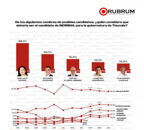 En el bloque morenista, Ana Lilia Rivera destaca como la principal opción para encabezar la candidatura rumbo al 2027, con un 38.1 por ciento de respaldo, superando con amplia ventaja a otros aspirantes dentro del mismo partido.