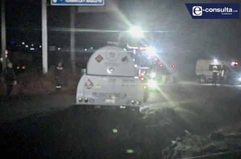 Momentos de tensión en la carretera Muñoz–Cuamantzingó, luego de que una pipa cargada con gas LP saliera del camino y volcara, quedando recostada dentro de una zanja a un costado de la vía.