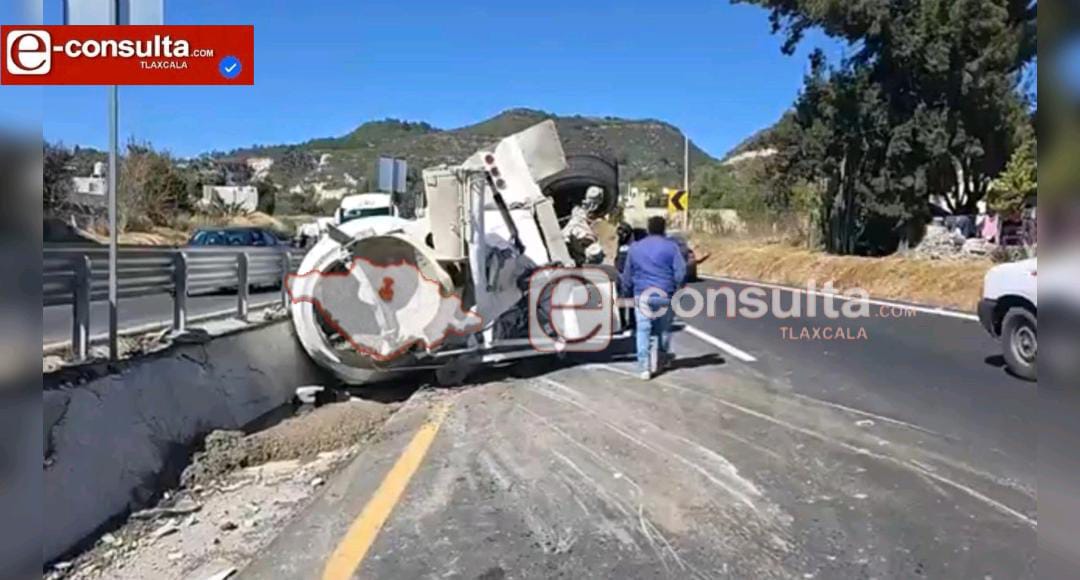 La mañana de este viernes se registró un accidente vial en la autopista Apizaco-Tlaxcala, a la altura de la zona de Tizatlán, donde un camión revolvedor de concreto perdió el control y terminó volcado.