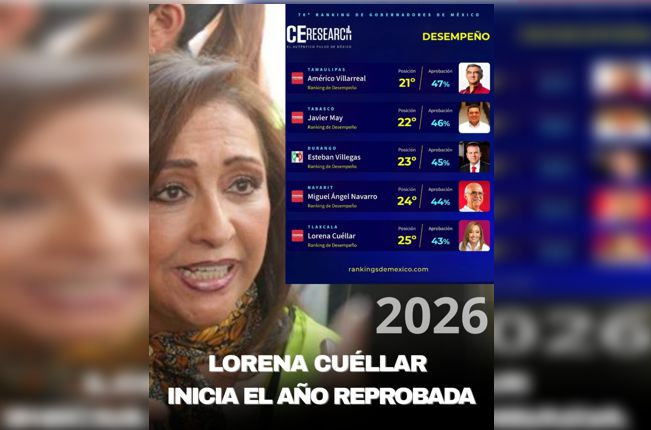 El año nuevo apenas comienza y ya trae consigo una noticia que no sorprende a nadie en las calles de este estado: la gobernadora Lorena Cuéllar Cisneros arranca 2026 con una reprobación vergonzosa por parte de los tlaxcaltecas. Según el más reciente ranking de desempeño de gobernadores publicado por Campaigns & Elections México (CE Online) correspondiente a enero de 2026, Cuéllar Cisneros se ubica en el bloque de los peor evaluados del país, con una aprobación que apenas ronda el 29%, colocándola entre los mandatarios morenistas con menor respaldo ciudadano.