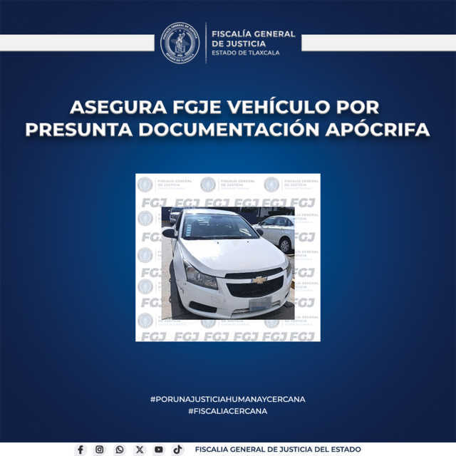 La Policía de Investigación de la Fiscalía General de Justicia del Estado (FGJE) aseguró un vehículo marca Chevrolet, tipo Cruze, modelo 2010, color blanco, al presentar posibles irregularidades en la documentación exhibida para su revisión.
