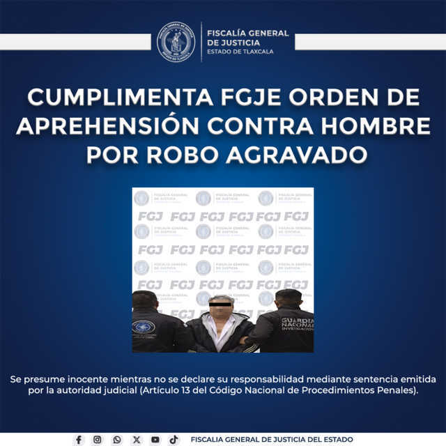 Con estas acciones, la Fiscalía General de Justicia del Estado reitera su compromiso de presentar ante un Juez a toda persona que atente contra la seguridad y el patrimonio de la ciudadanía tlaxcalteca.