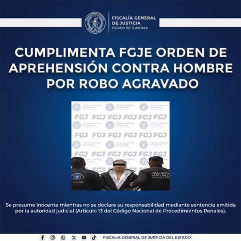 Elementos de la Policía de Investigación, adscritos a la Fiscalía General de Justicia del Estado (FGJE), cumplimentaron una orden de aprehensión contra Miguel N., por el delito de robo agravado.