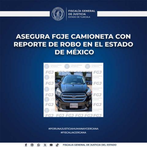 Elementos de la Policía de Investigación, adscritos a la Fiscalía General de Justicia del Estado (FGJE), aseguraron una camioneta marca Ford, color negro, modelo 2018, la cual contaba con un reporte de predenuncia de robo, además de presentar documentación presuntamente apócrifa.