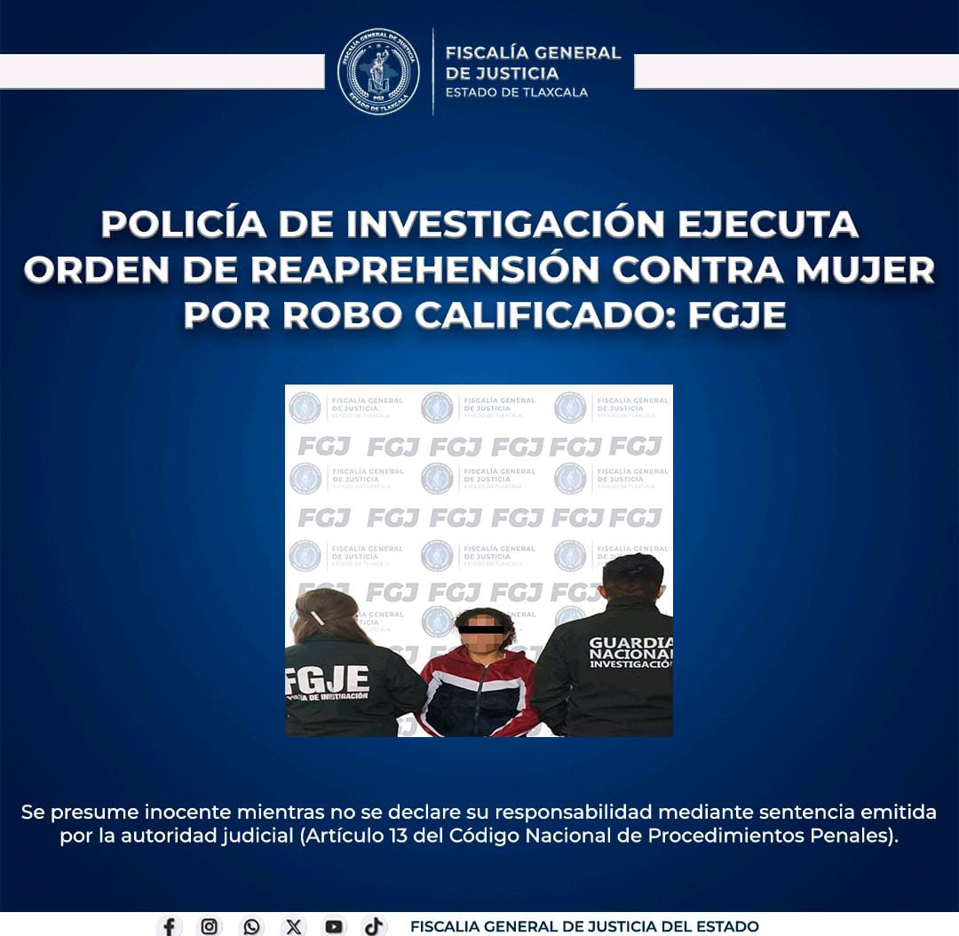 Agentes de la Policía de Investigación de la Fiscalía General de Justicia del Estado (FGJE) ejecutaron una orden de reaprehensión en contra de Guadalupe N., por el incumplimiento de las medidas cautelares impuestas dentro del proceso penal que enfrenta por el delito de robo calificado.