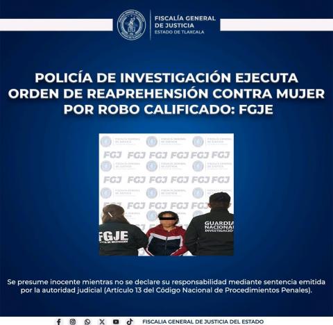 Como resultado del trabajo coordinado entre ambas instituciones, la mujer fue aprehendida en San Lorenzo Almecatla, estado de Puebla, donde se le hicieron saber los derechos que le asisten como persona detenida. Posteriormente, fue trasladada a la entidad tlaxcalteca, a fin de ser presentada ante el Juez Penal y continuar con el procedimiento.