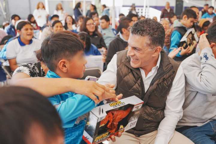 En el evento, que presidió la gobernadora del estado, Lorena Cuéllar Cisneros, y la presidenta del Sistema DIF Estatal, Mariana Espinosa de los Monteros Cuéllar, el alcalde formó parte de la entrega de juguetes a niñas y niños del plantel, una acción orientada a fortalecer los valores de inclusión, unidad y solidaridad entre la infancia tlaxcalteca.