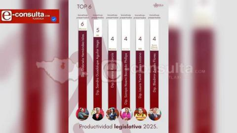 En el mismo ranking de productividad legislativa se encuentran Sandra Aguilar Vega, del PRI, con cinco iniciativas en proceso; Lorena Ruiz García, de MORENA, con cuatro iniciativas en análisis; Soraya Noemí Bocardo Phillips, diputada independiente, con cuatro iniciativas en proceso; Laura Yamili Flores Lozano, del PRD, con cuatro iniciativas también en proceso; y Bladimir Zainos Flores, de Nueva Alianza Tlaxcala, con cuatro iniciativas, de las cuales tres ya fueron aprobadas y una permanece en comisiones.