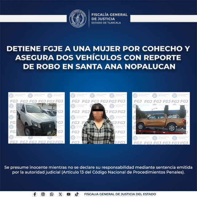 La Fiscalía General de Justicia del Estado (FGJE), a través de la Policía de Investigación, realizó la detención en flagrancia de Brenda N. por el delito de cohecho y aseguró dos vehículos que contaban con reporte de robo en el municipio de Santa Ana Nopalucan.