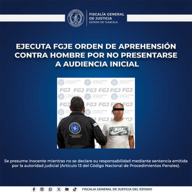 Elementos de la Policía de Investigación de la Fiscalía General de Justicia del Estado (FGJE) ejecutaron una orden de aprehensión en contra de Samuel N., por no presentarse a la audiencia inicial en el proceso que enfrenta por el delito de incumplimiento de la obligación alimentaria, en perjuicio de sus dos hijas.